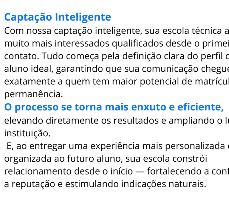 Não vendemos 'likes' ou métricas de vaidade. Nosso foco é custo por matrícula, LTV (Lifetime Value) do aluno e redução de evasão.