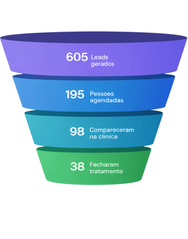 Em um cenário simulado, considerando um ticket médio conservador entre R$ 1.500 e R$ 2.500, esse funil pode representar um faturamento potencial estimado entre R$ 57 mil e R$ 95 mil, variando conforme tipo de tratamento, região e capacidade de atendimento da clínica.